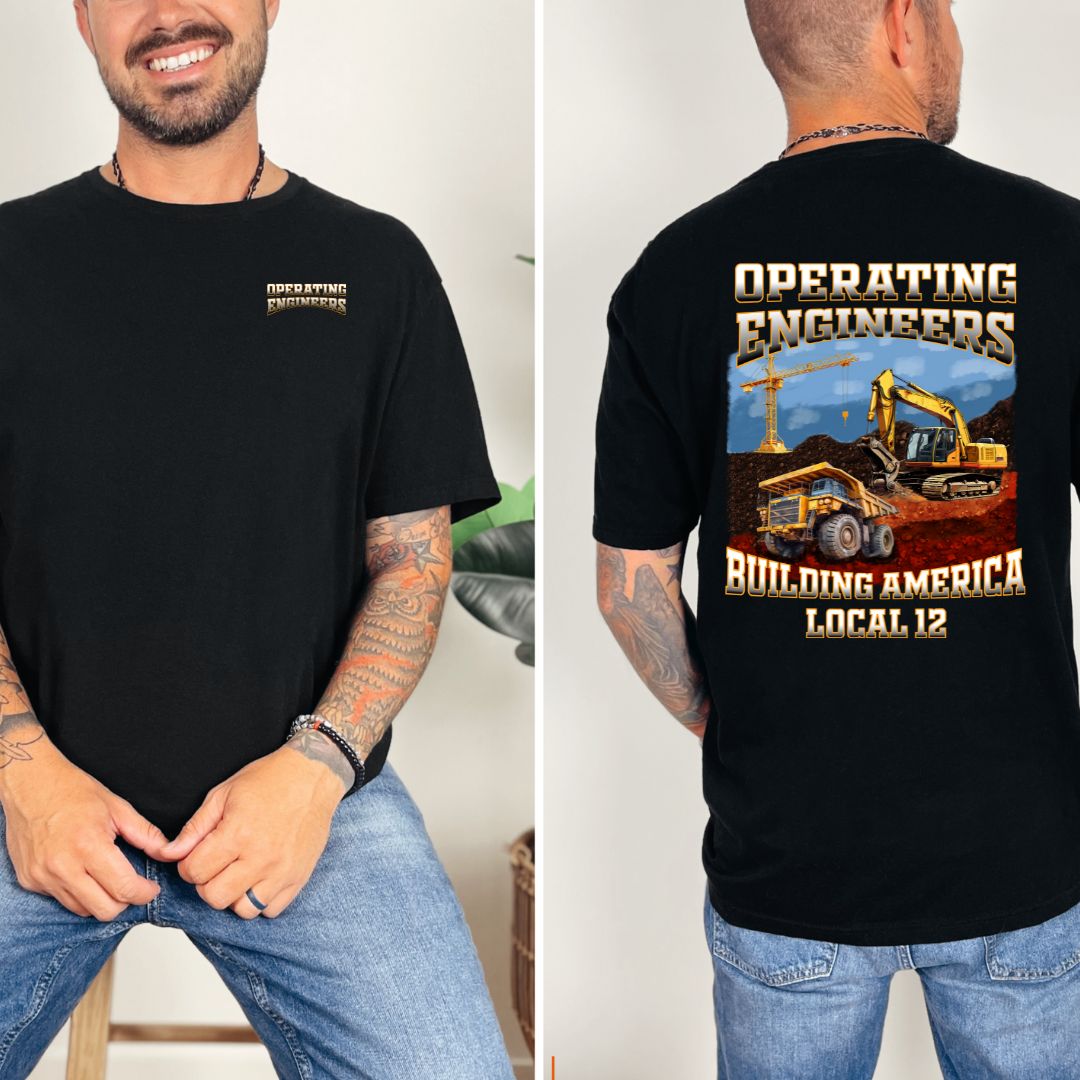 This Operating Engineers Building America Local 12 T-shirt features a durable black Ultra Gildan fabric, designed for comfort and long-lasting wear. Ideal for members and supporters, it offers a professional look while representing Local 12 pride. The high-quality material ensures breathability and resilience, making it suitable for both work and casual settings.